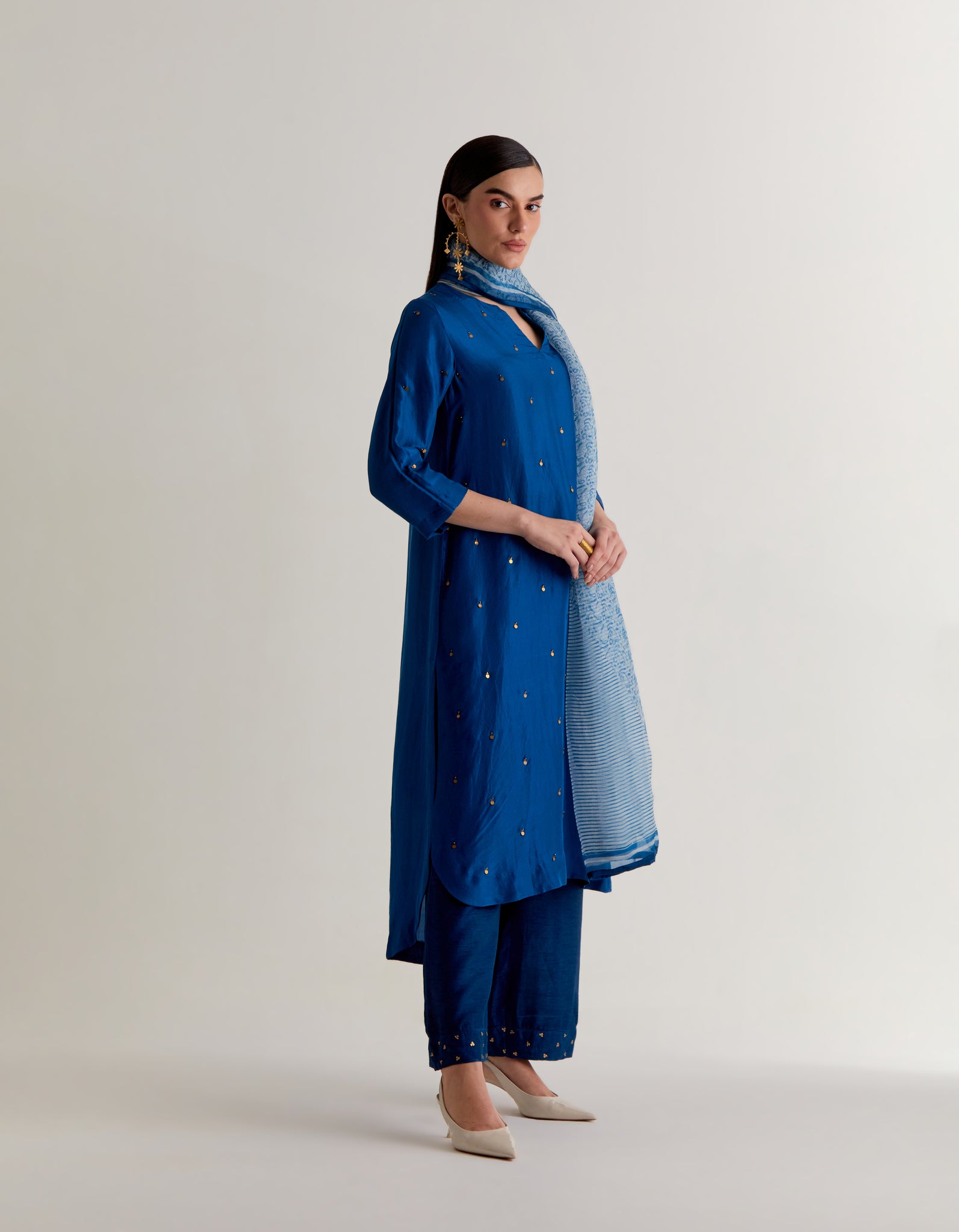 Crafted in pure silk, this elegant free size kurta us designed for effortless sophistication. The sillhotte features delicate pleats at the back for a graceful fall. Front and the pants hemline are adorned with intricate hand embroidery adding artisanal charm. Paired with lightweight silk organza dupatta, hand block printed with azo free dyes. This ensemble blends timeless tradition with contemporary ease.