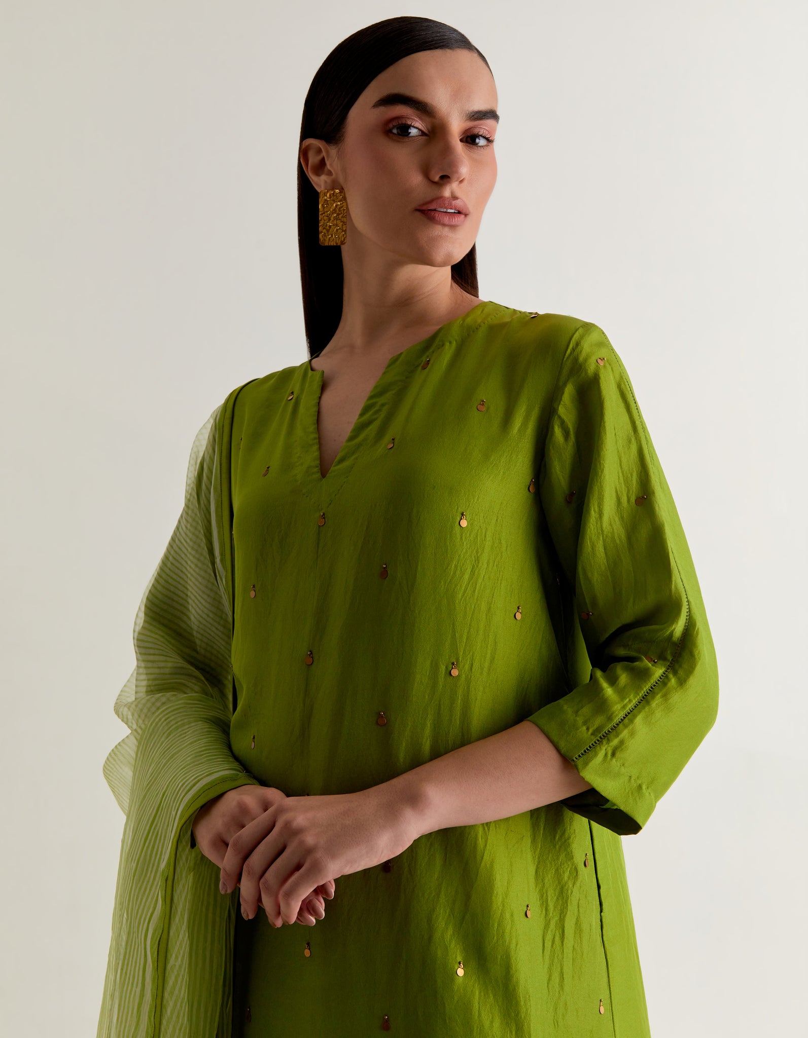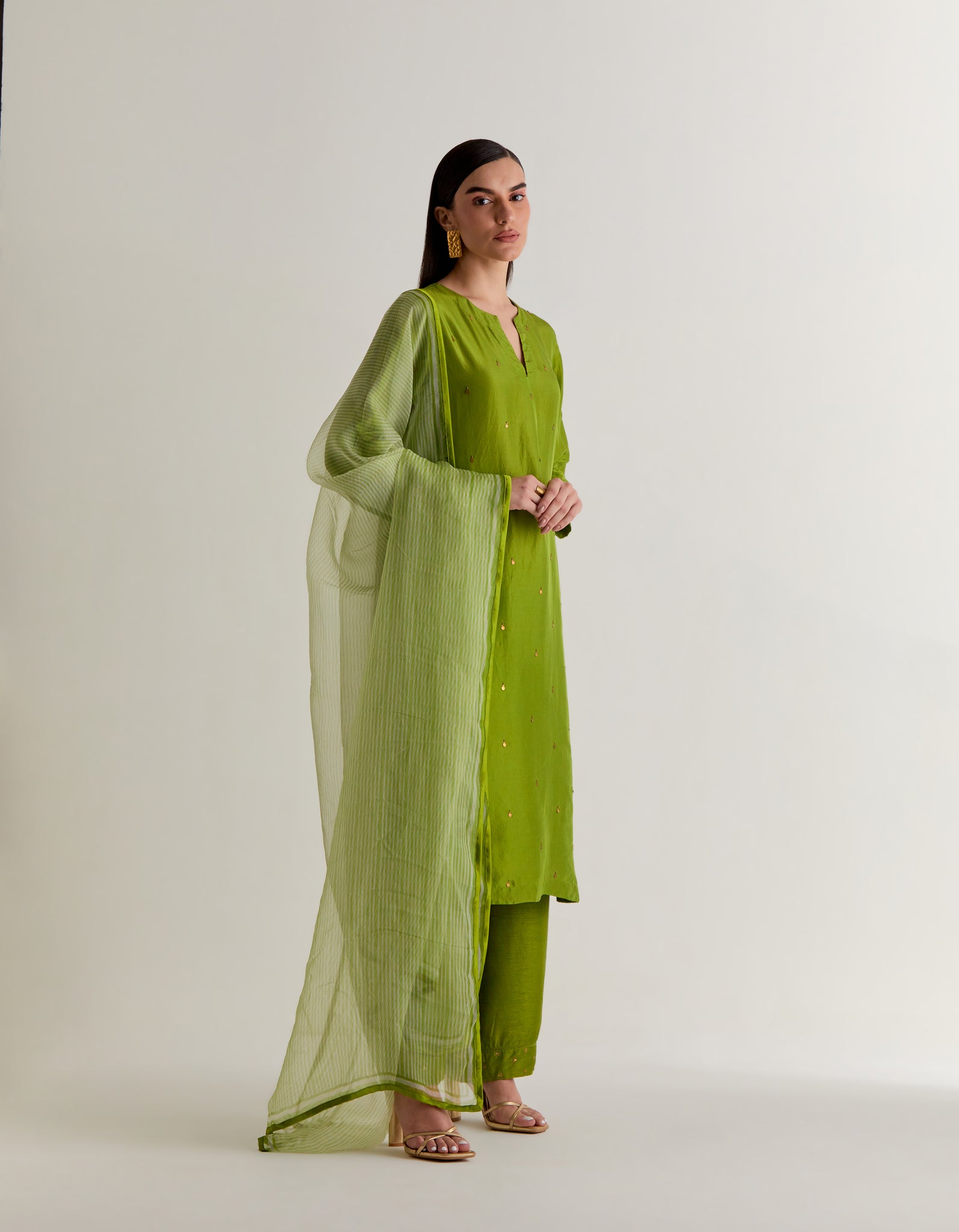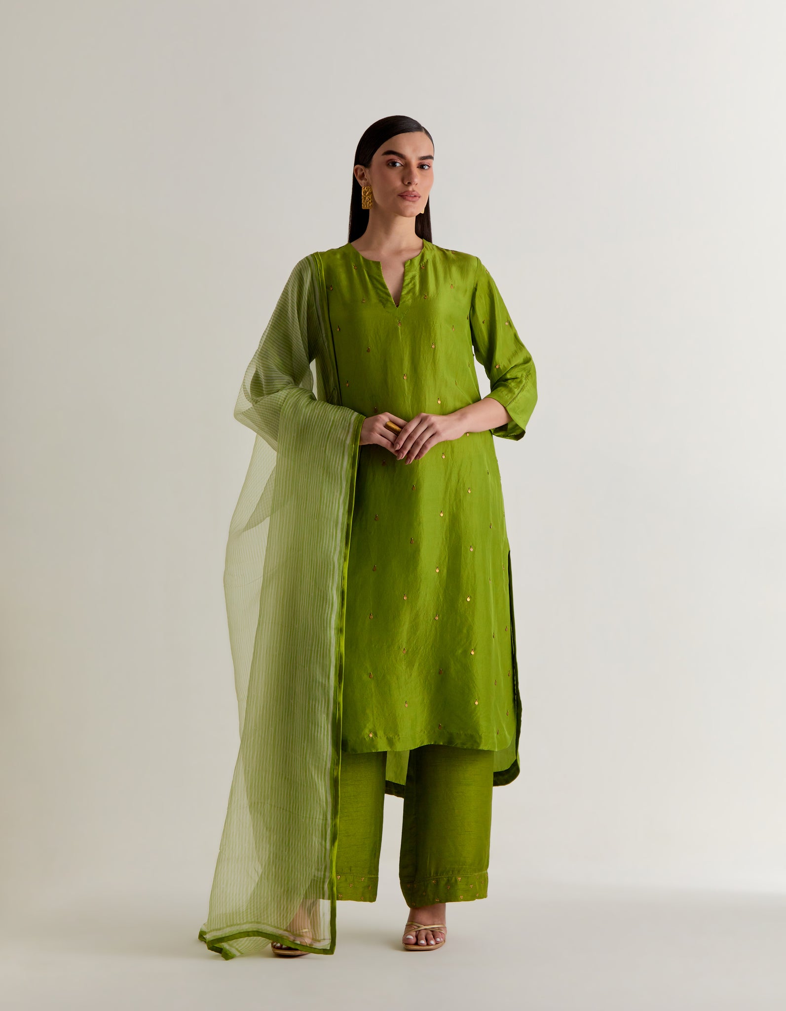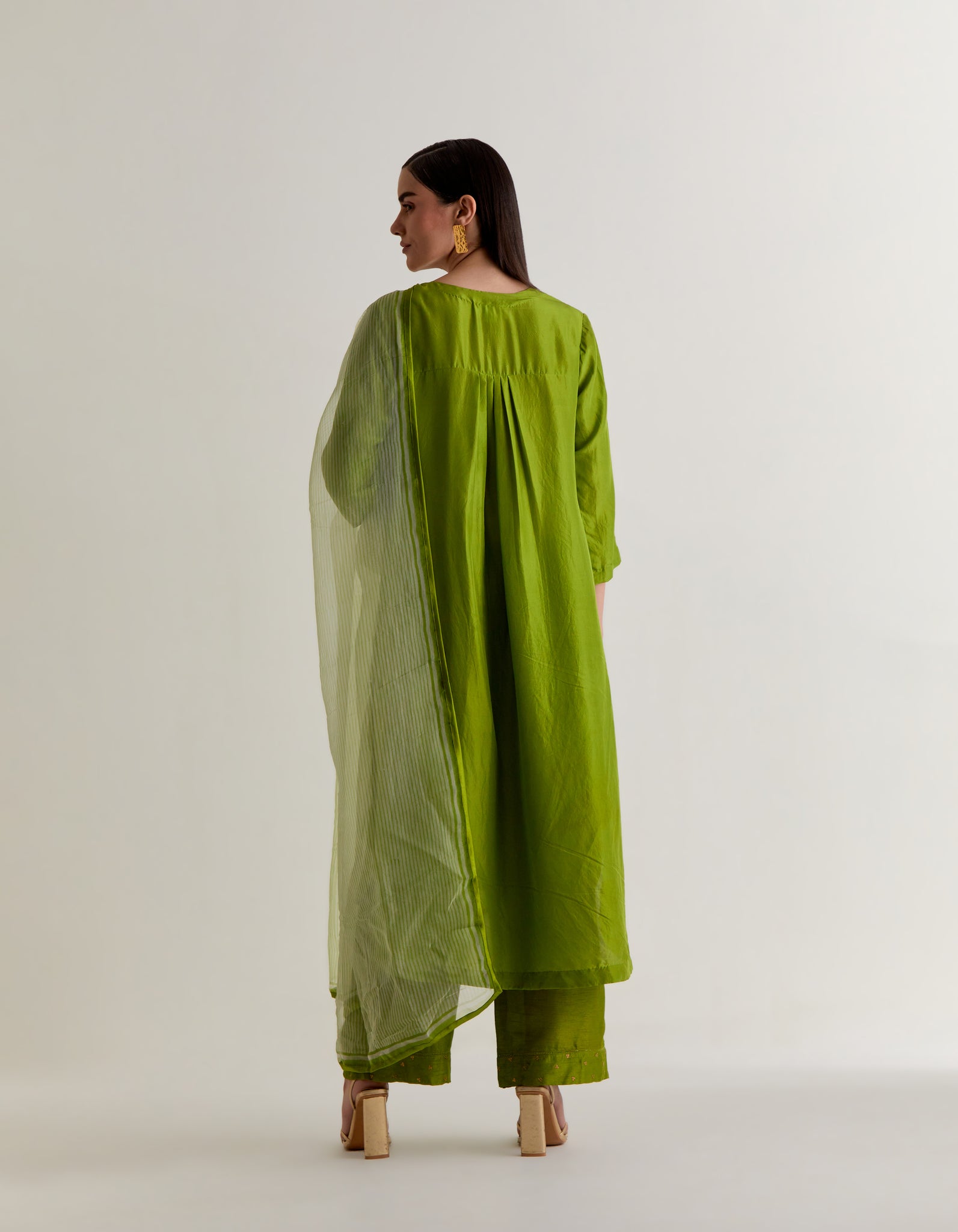 | Crafted in pure silk, this elegant free size kurta us designed for effortless sophistication. The sillhotte features delicate pleats at the back for a graceful fall. Front and the pants hemline are adorned with intricate hand embroidery adding artisanal charm. Paired with lightweight silk organza dupatta, hand block printed with azo free dyes. This ensemble blends timeless tradition with contemporary ease. |