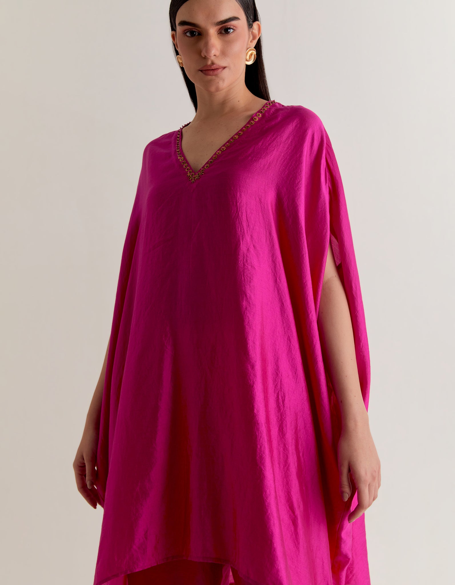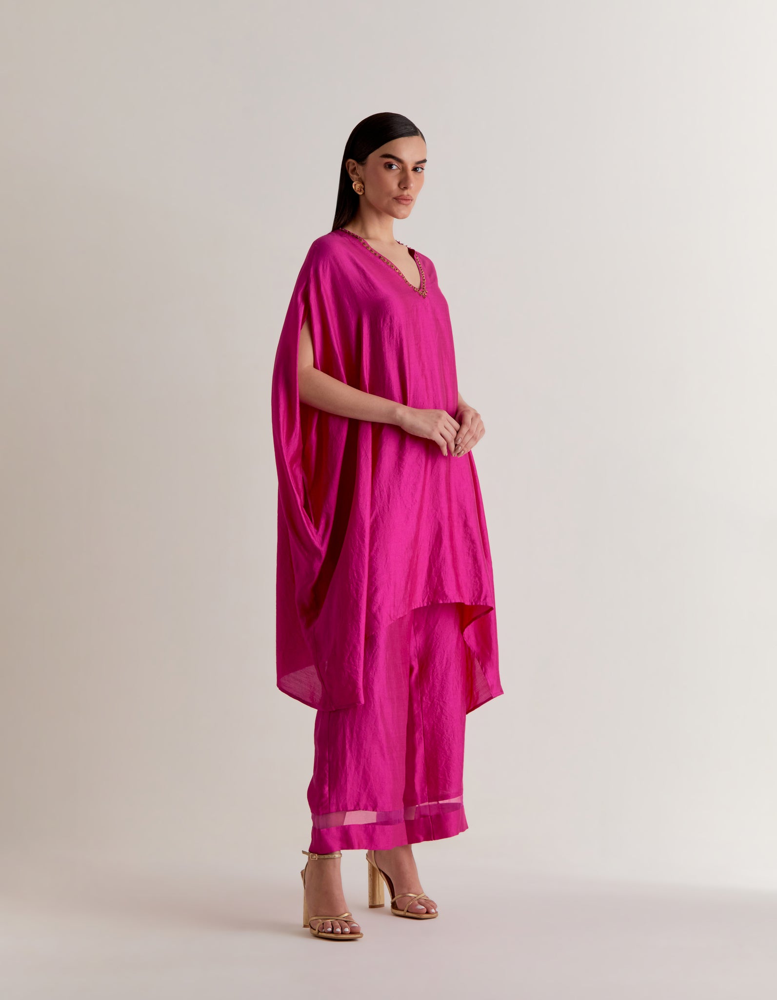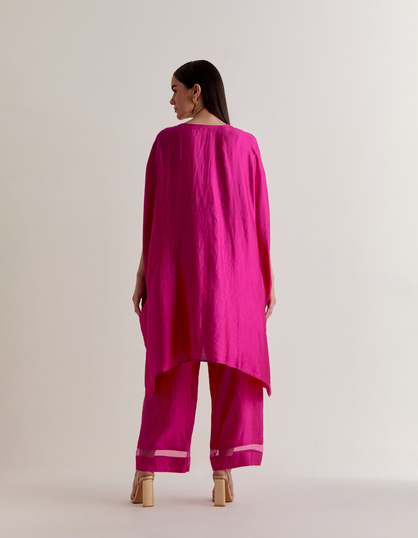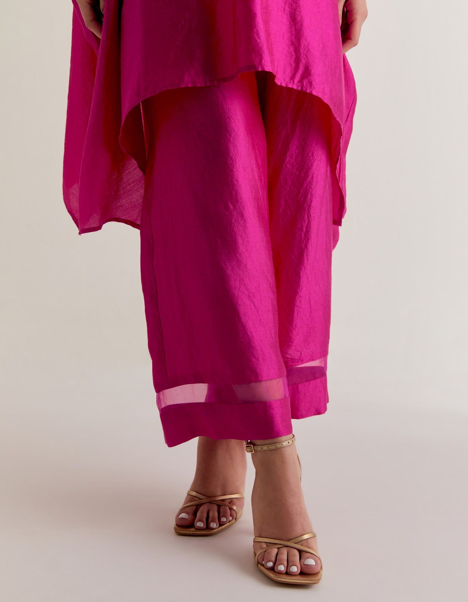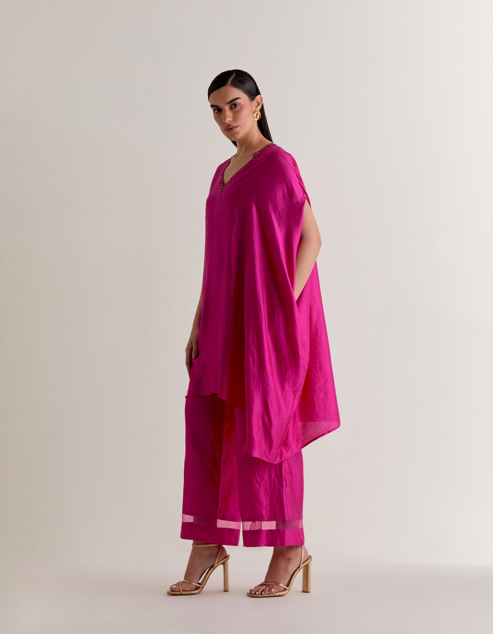 | Crafted in luxurious handwoven silk, this Co-Ord set pairs a free size top with fit-to-size pants. The neckline is highlighted with delicate hand embroidery and subtle detailing for an elegant touch. Its rich festive color and fluid fall make it perfect for the festive season- style it with a stetment jewels for an effortless chic Diwali or evening party look. |