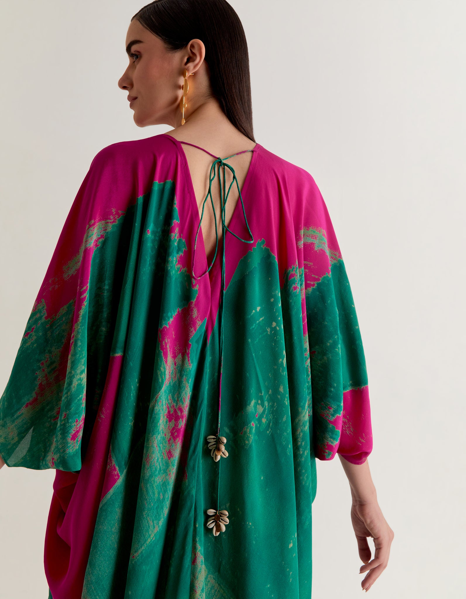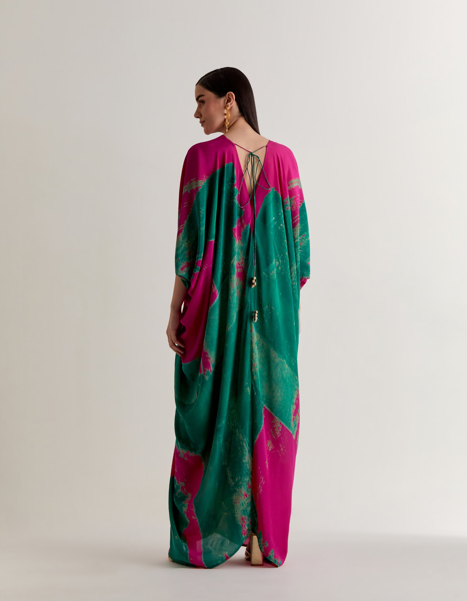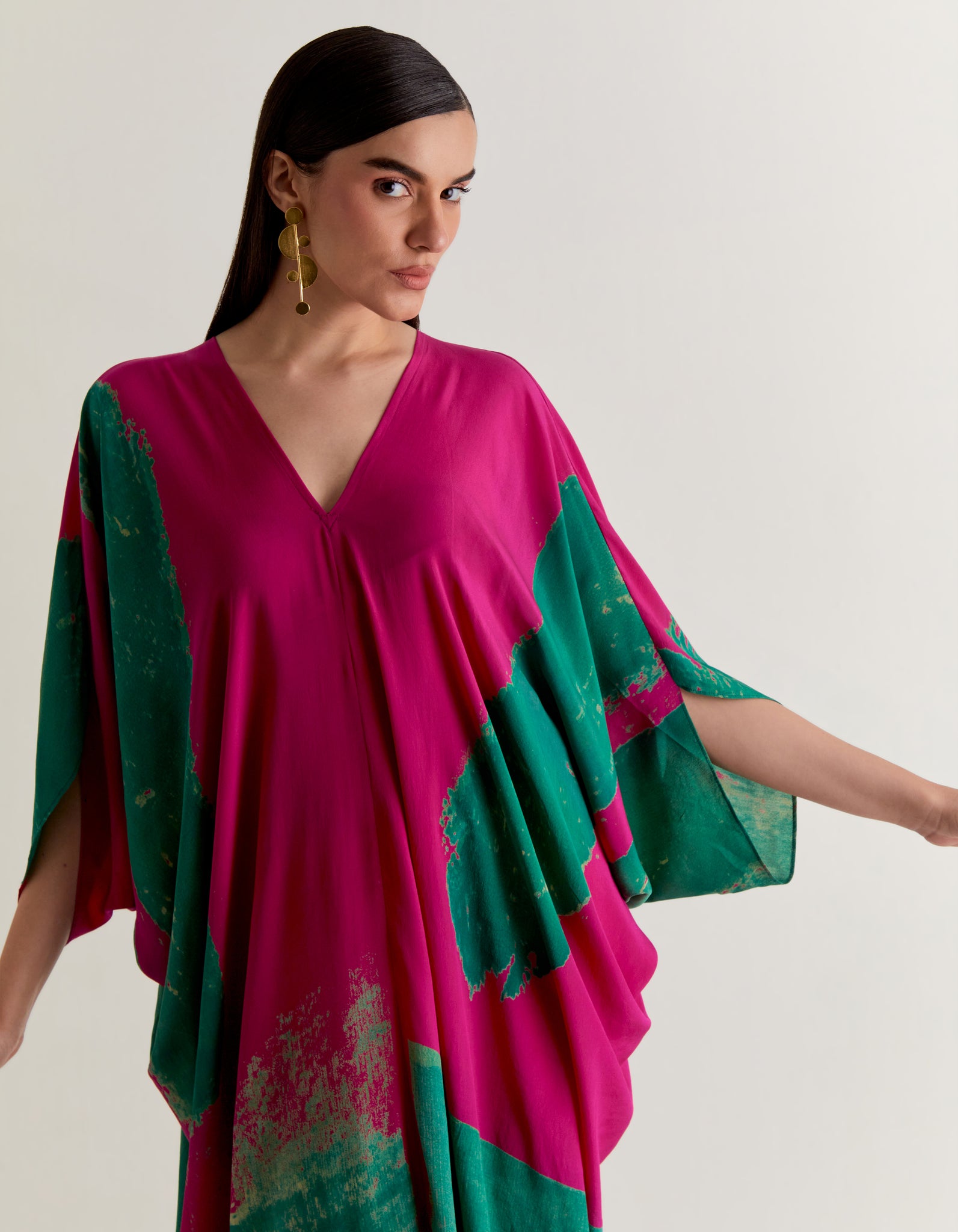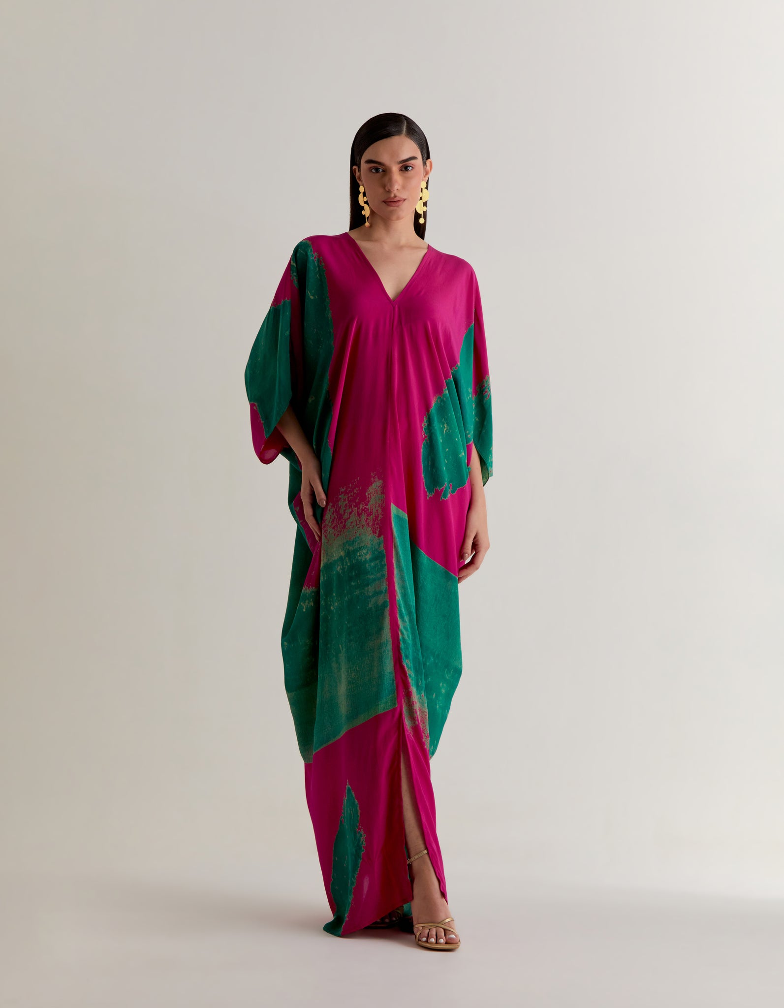 | A pure silk crepe dress with hand printed abstract print, its fluid, sensual, and versatile. Ideal for evening parties, lounging in style and effortless vacation dressings. It’s a free size, length is 57" |