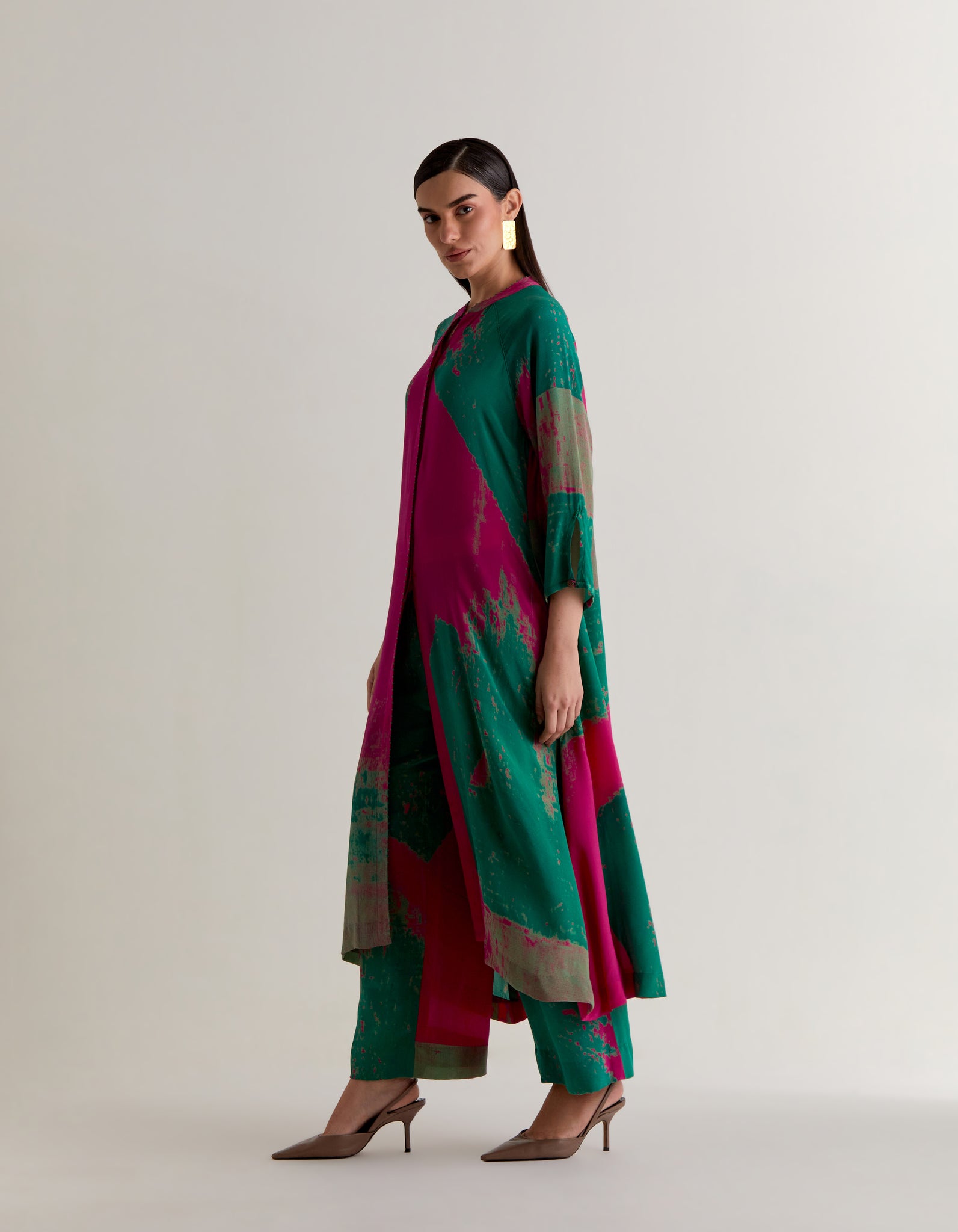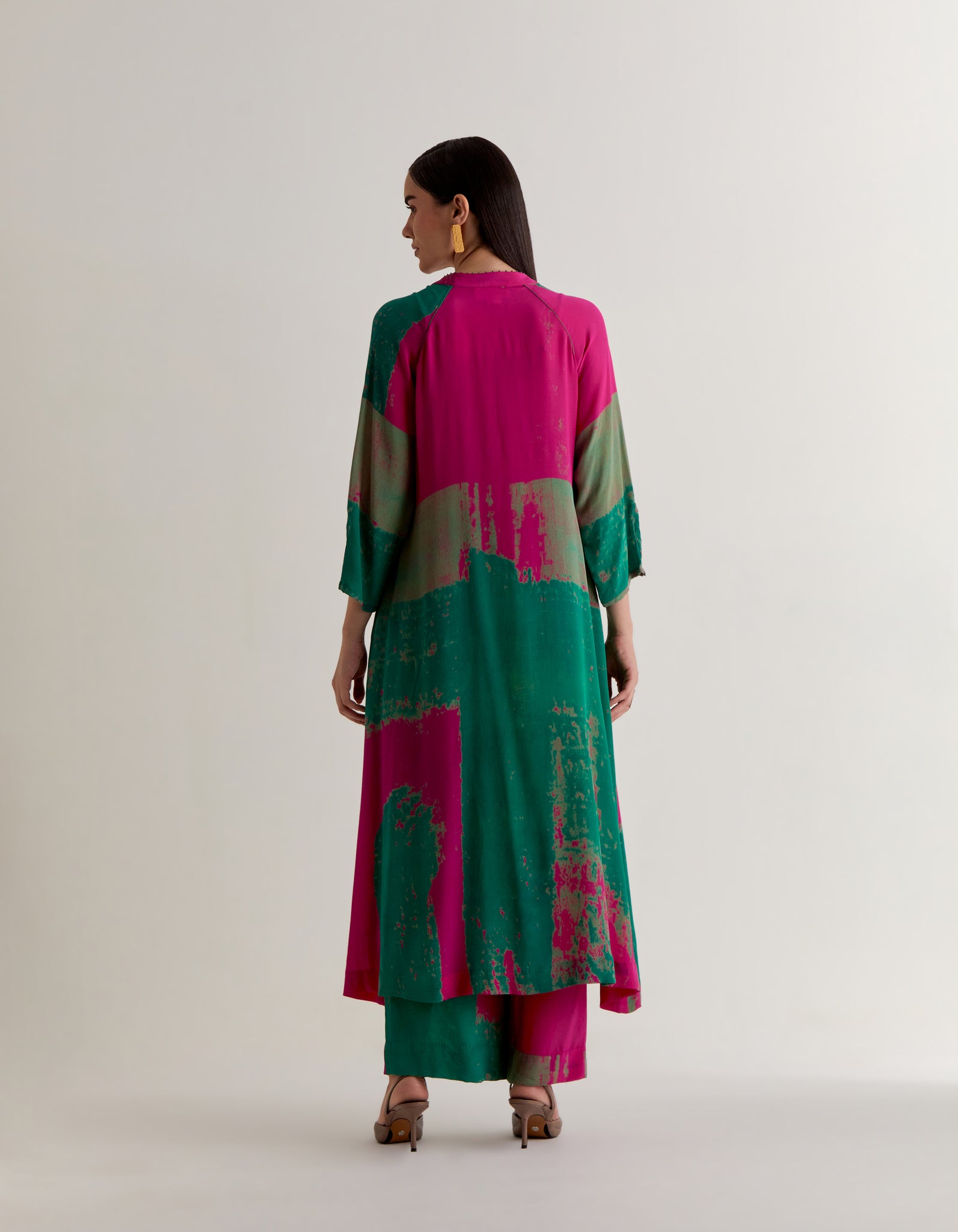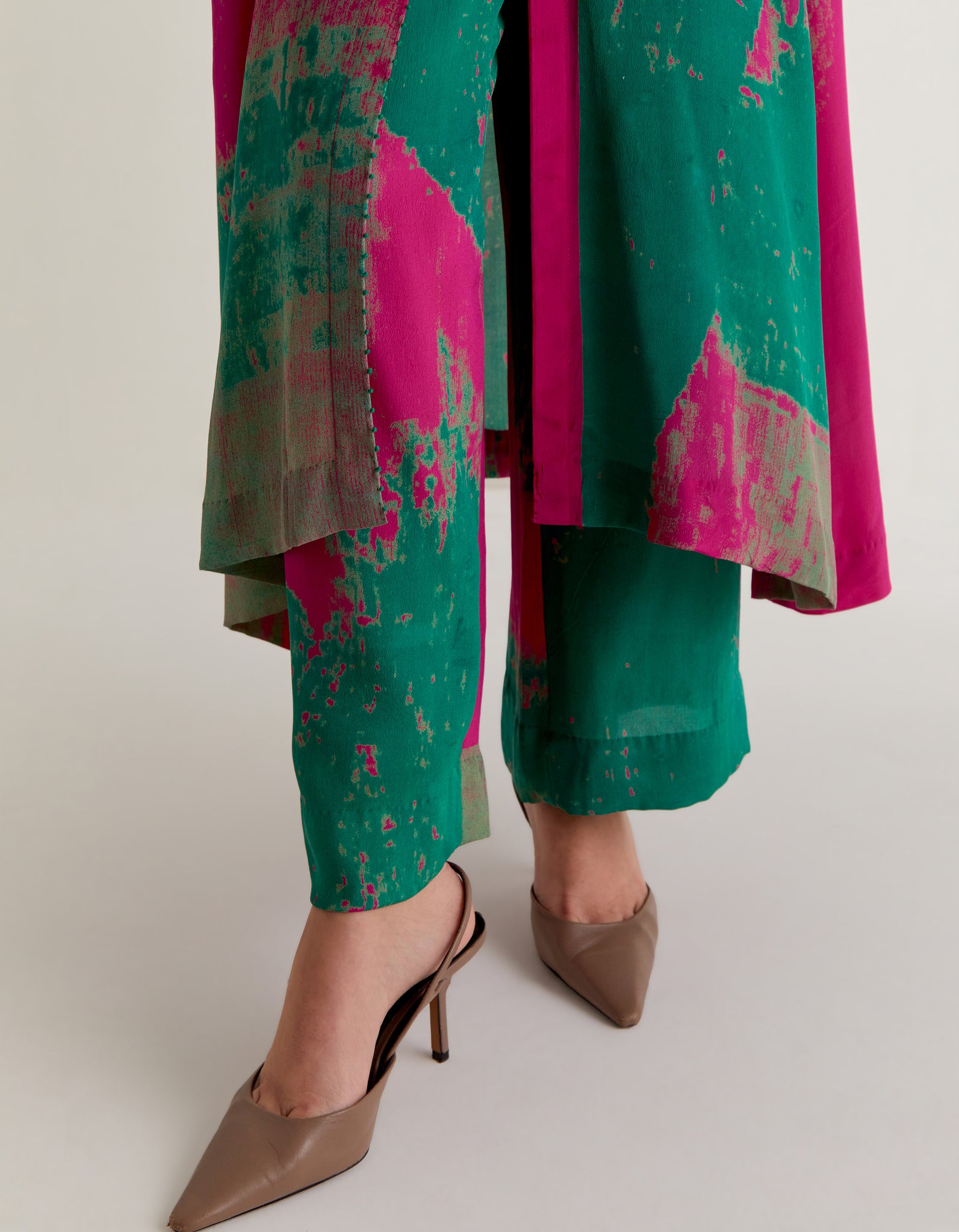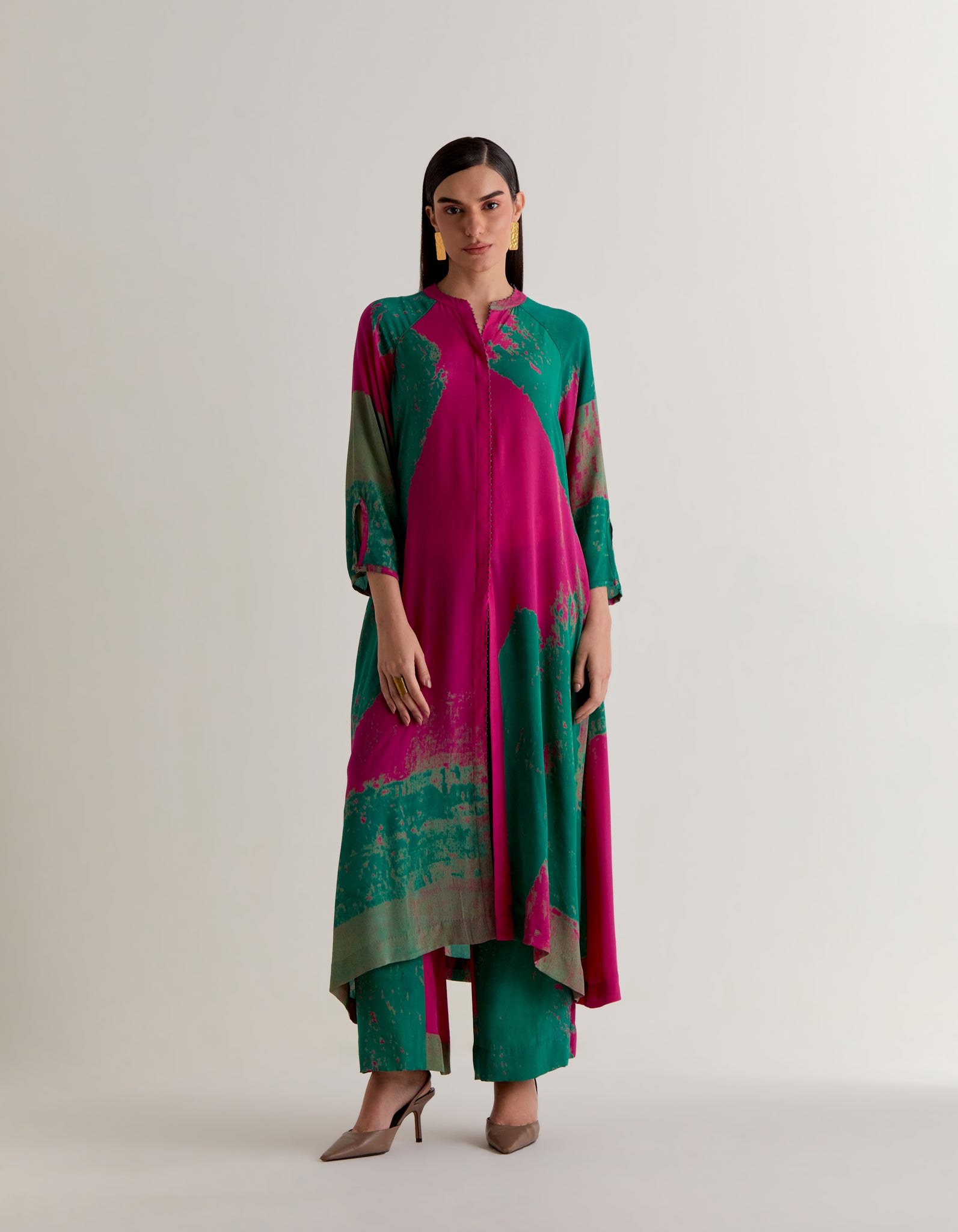 A fluid A line silhouette meets the modern detailing in this long tunic, crafted in our signature abstraction print. The collar and the placket is delicately embroidered adding a touch if artisanal elegance. Accompanied by a matching printed pants and finished with high slit in the front. This garment is both sophisticated and classic- perfect for evenings and travelling. |