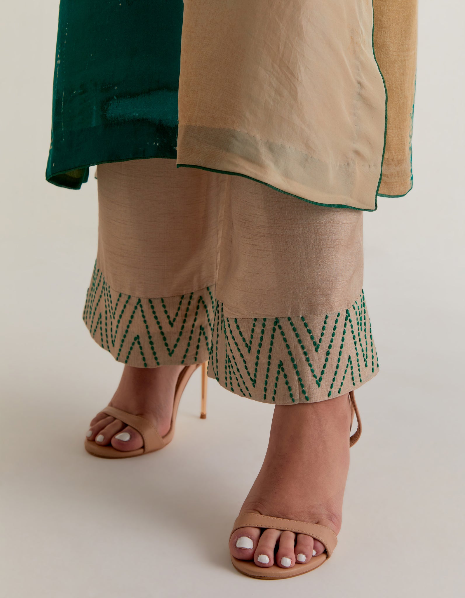 | Art meets fashion, - a pure silk high slit kurta with an abstract painting inspired print, paired with hand embroidered solid silk pants. A versatile look for day and evening. Easy to elevate, perfect anywhere. |